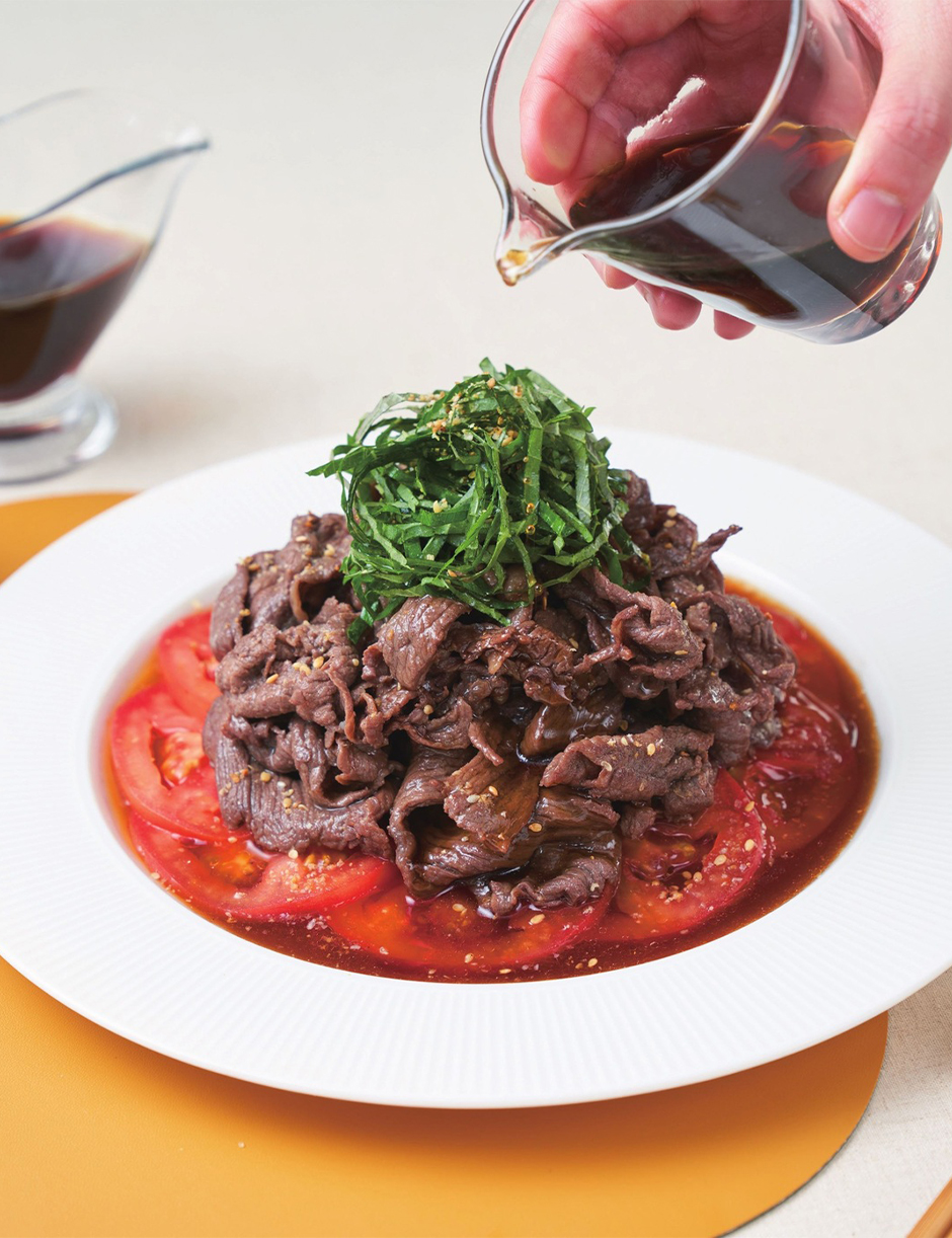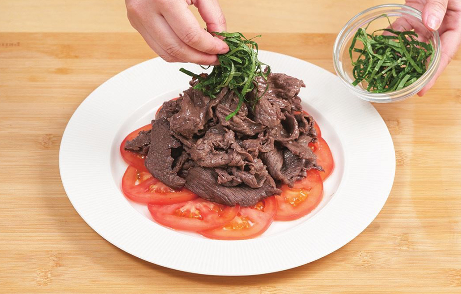 ⑤ 접시에 토마토와 소고기를 담고 그 위에 깻잎과 깻가루를 뿌리면 완성!