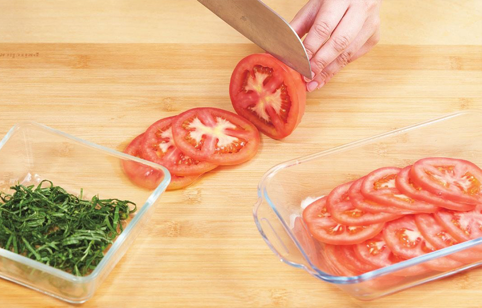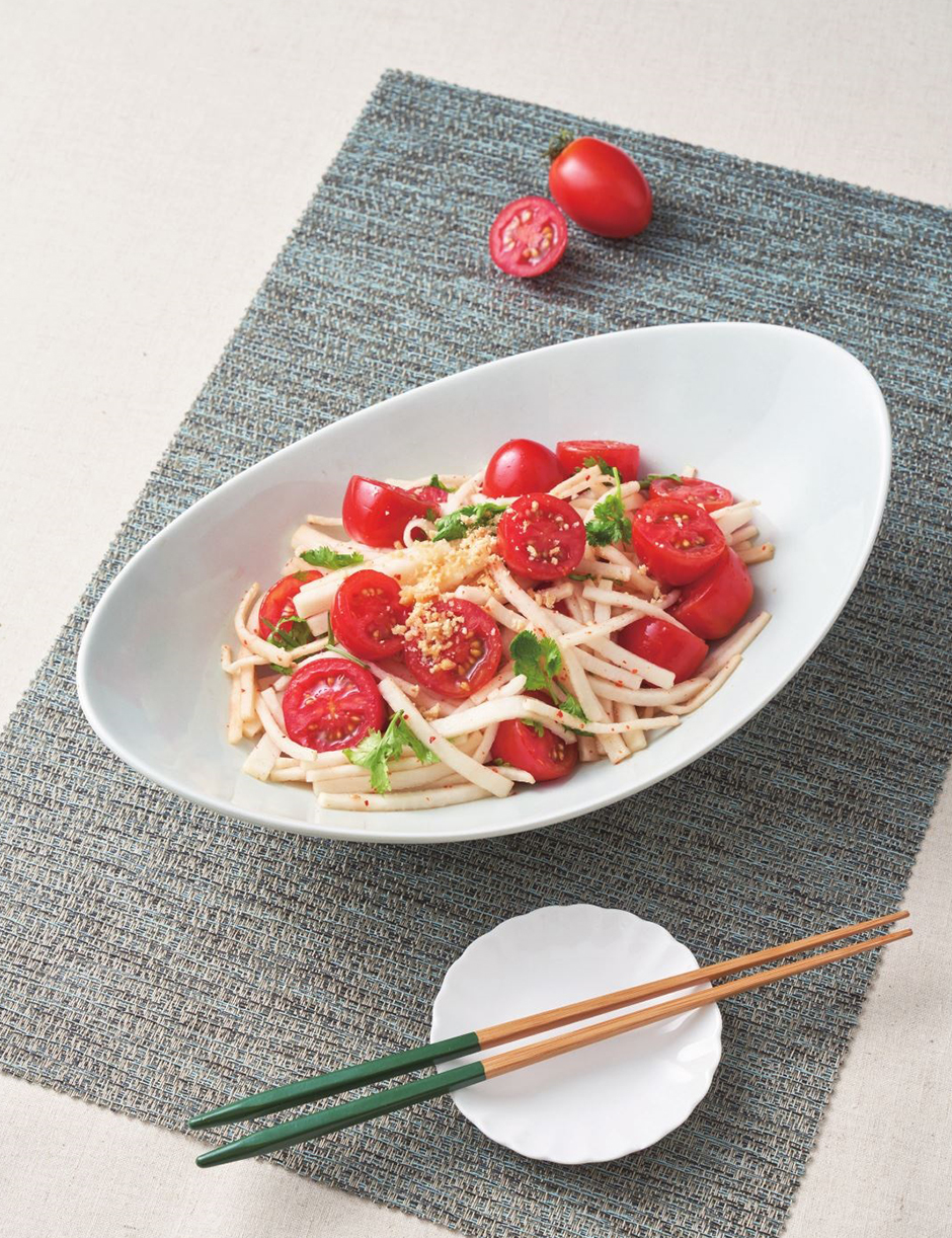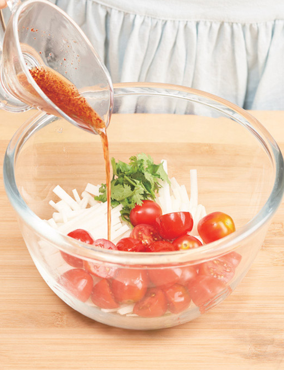 ① 깻잎은 돌돌 말아 가늘게 채 썰고, 토마토는 가로로 얇게 편 썹니다.