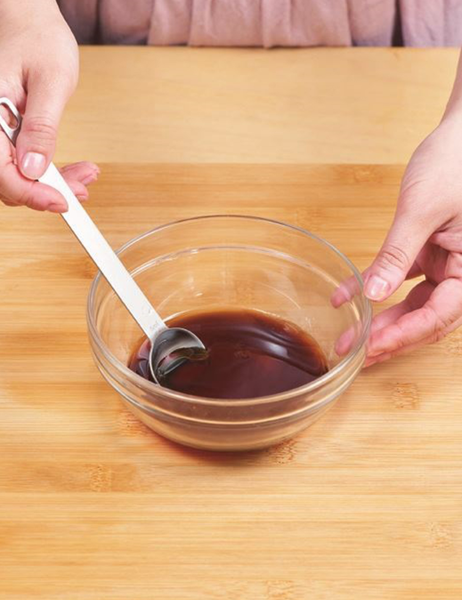 ④ 소스 재료에서 참기름·들기름·식초를 뺀 나머지만 섞어서 전자레인지에 1분 돌린 다음, 참기름과 들기름, 식초를 섞어줍니다.