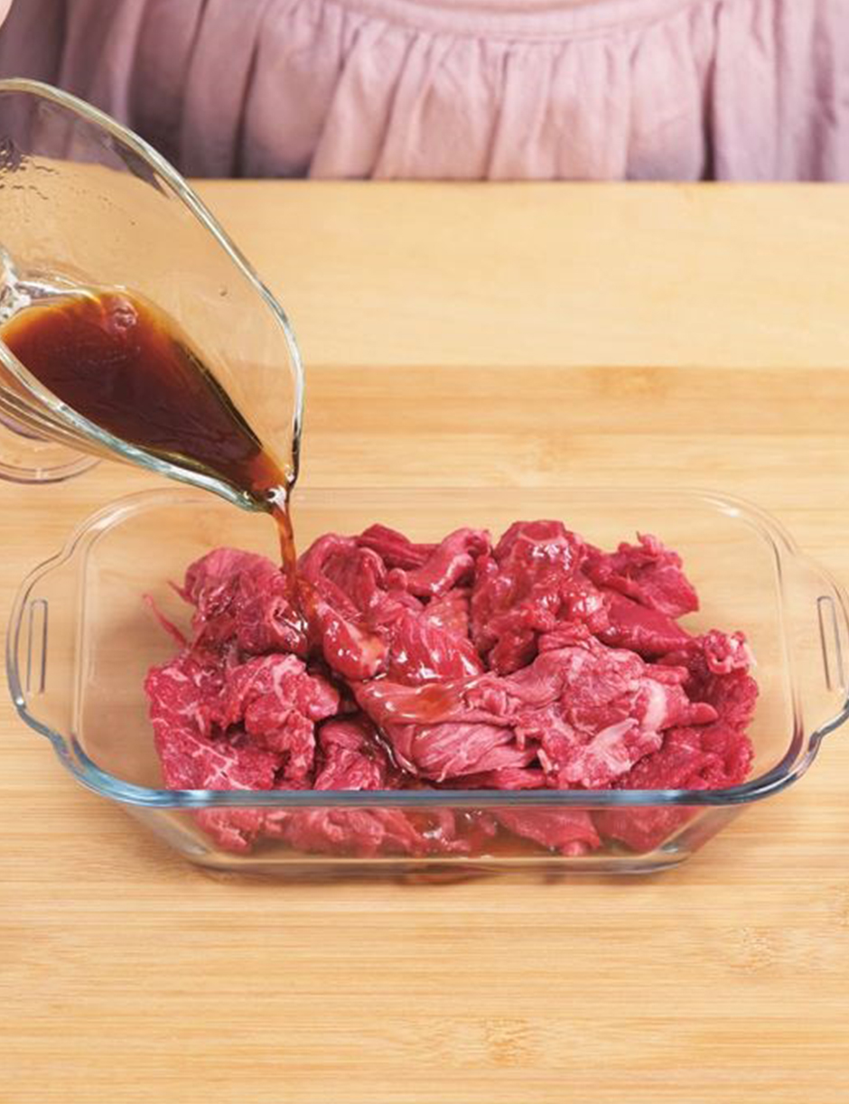 ③ 2의 소스의 1/2만 소고기에 버무려 10분 이상 재웁니다.