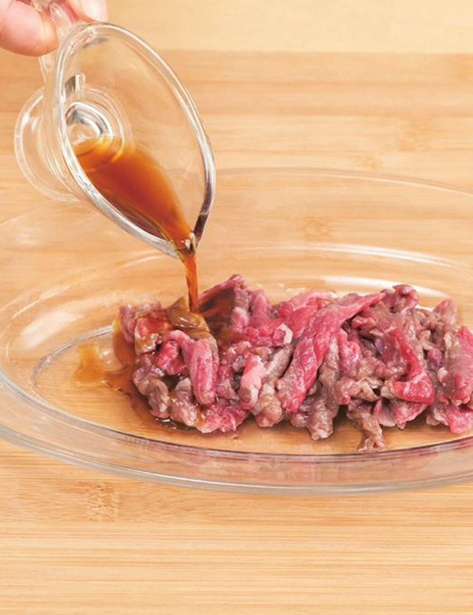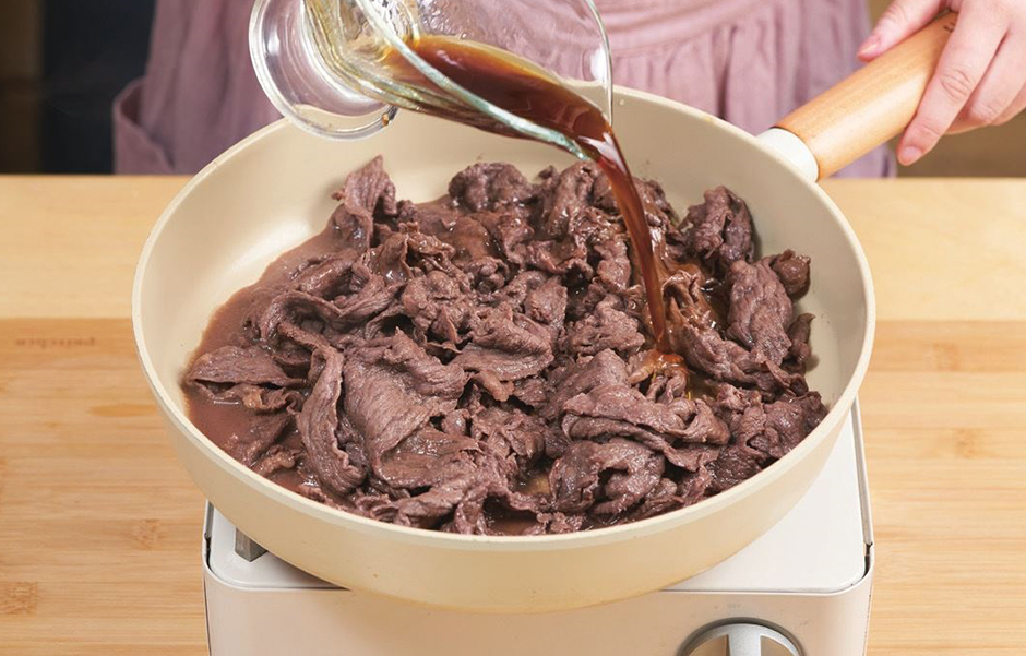 ④ 강불로 달군 팬에 식용유를 두르고 소고기를 올려 중·강불에 재빨리 굽고 난 후, 불을 끄고 남은 소스를 넣어 한 번 더 버무립니다.