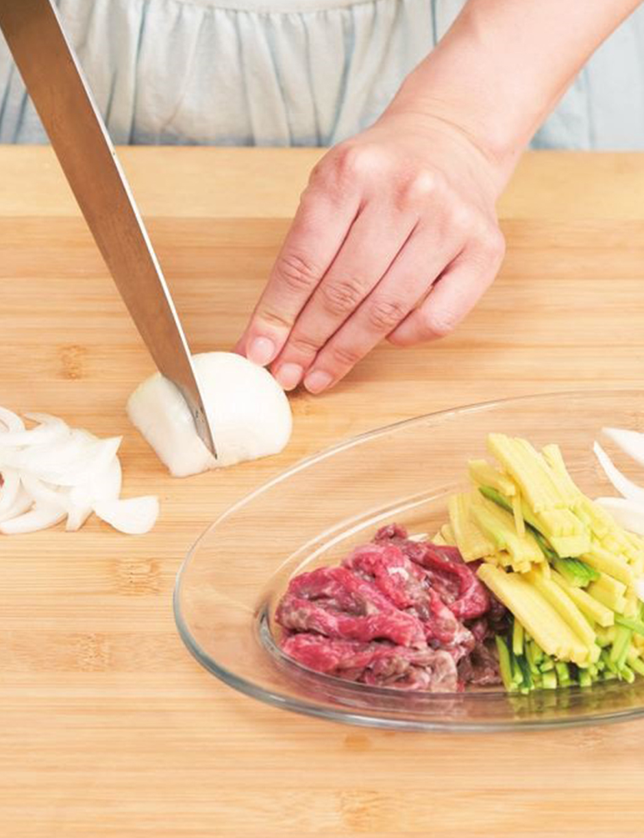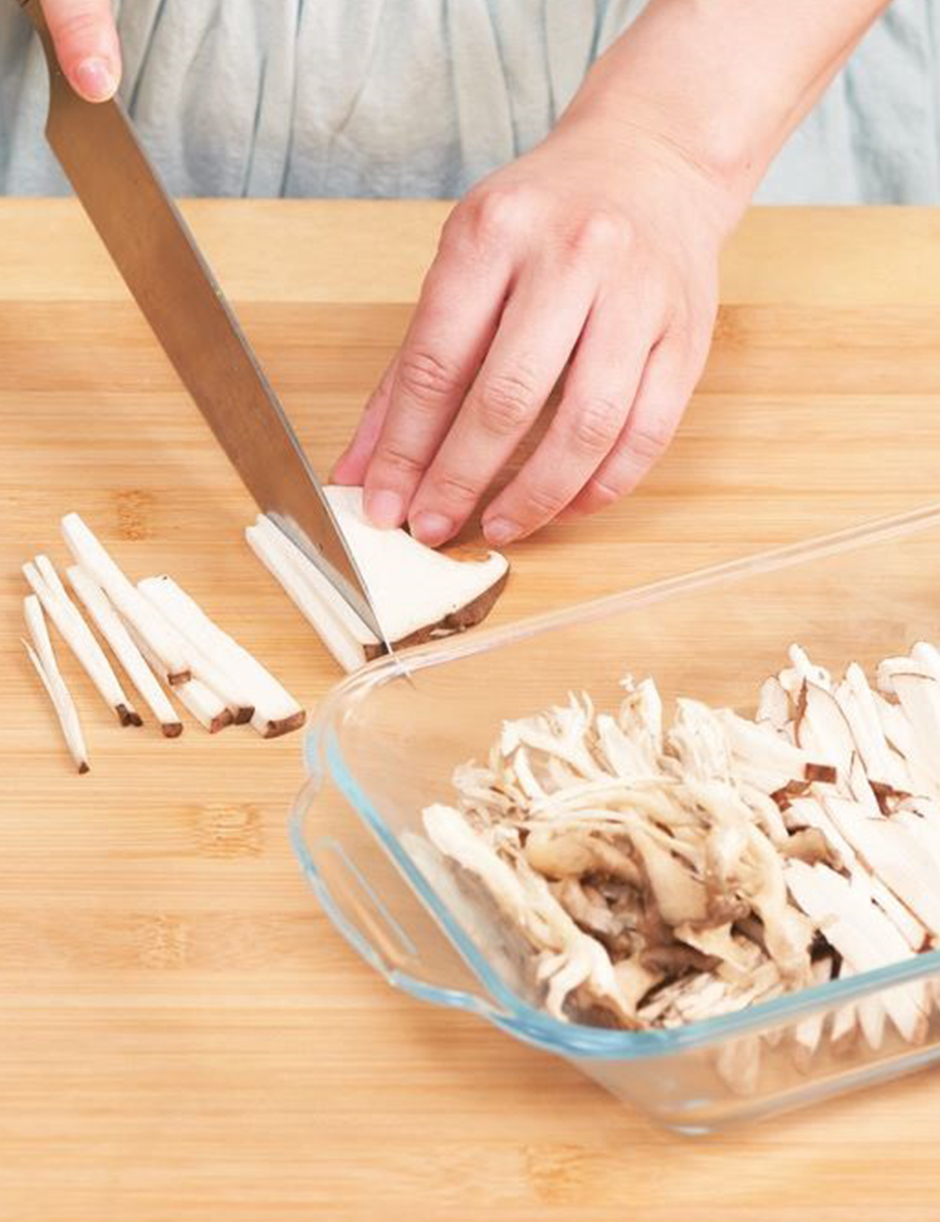 ② 버섯과 양파·애호박·고기는 채 썹니다.