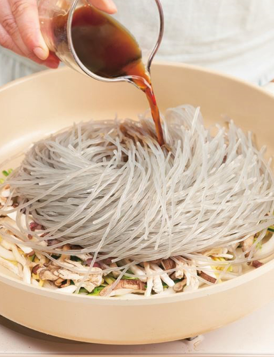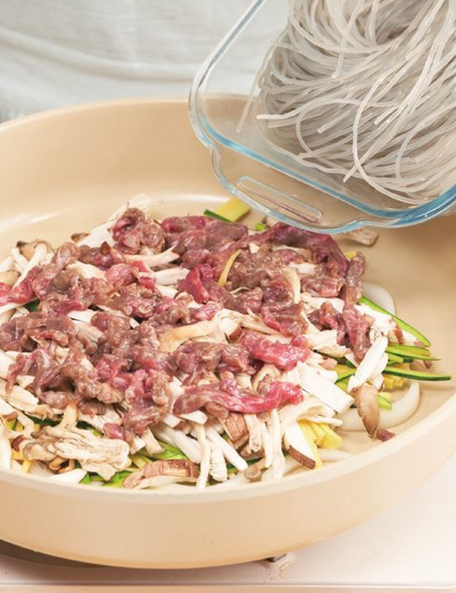 잡채는 대표적인 잔치 음식이지만 만드려면 여간 손이 많이 가지 않는데요. 초간단 버섯잡채는 이름처럼 열전도율이 좋은 냄비 하나만 있으면 냉장고에 있는 각종 채소와 자투리 고기, 불린 당면까지 다 같이 넣고 라면 끓이듯 간단하게 요리할 수 있습니다.