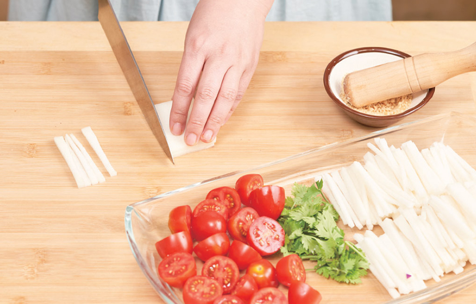 ① 콜라비는 채 썰고, 방울토마토는 반으로 자르고, 땅콩은 빻고, 고수는 1cm 간격으로 자릅니다.