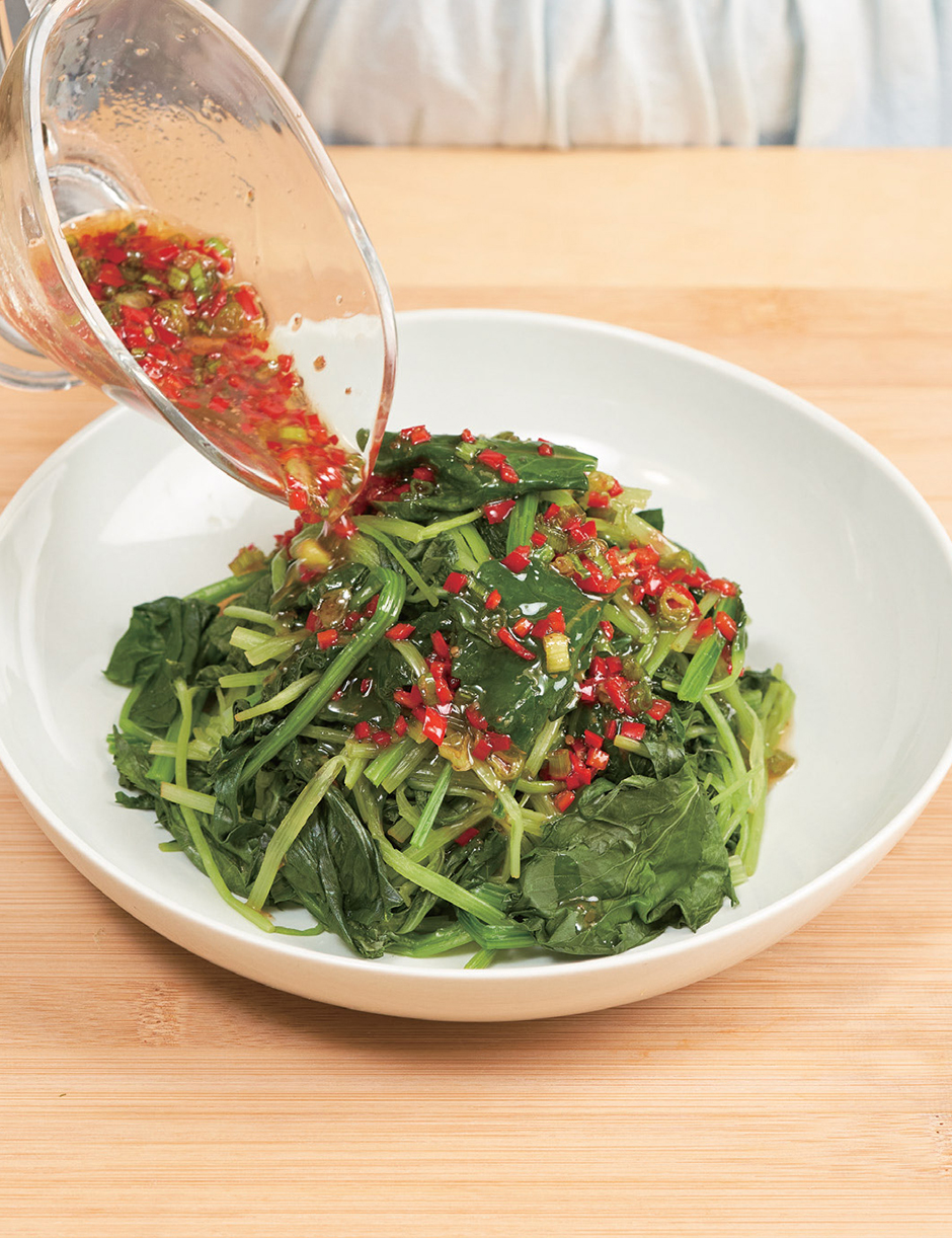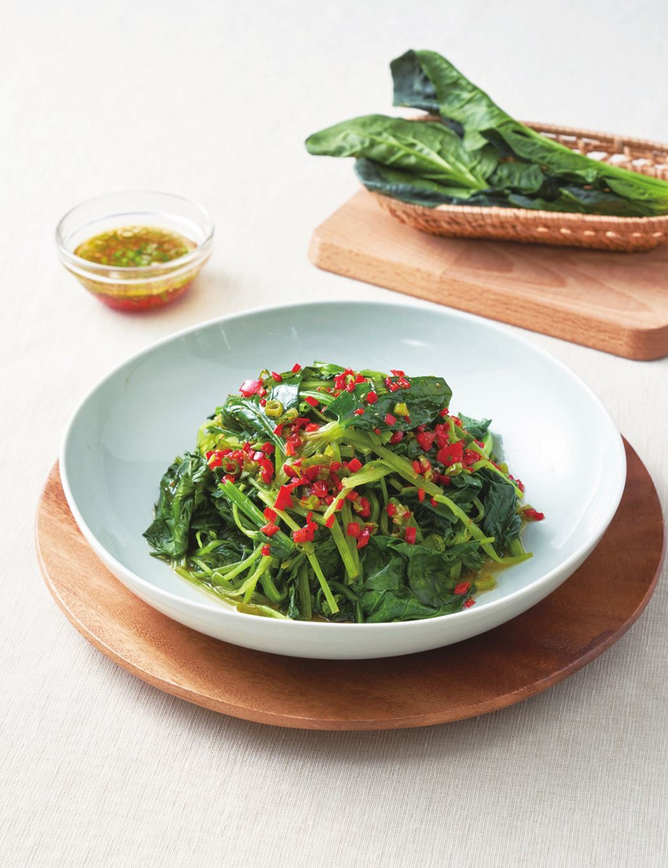 둥글고 움푹한 흰 접시 가운데 데친 나물을 높이 쌓고 소스를 골고루 뿌리면 맛깔스러워 보인답니다. 나물은 살짝 데치고 소스는 먹을 때 손님 앞에서 뿌리면 아삭한 맛도 살고 좀 더 샐러드와 가까운 느낌을 줄 수 있습니다.