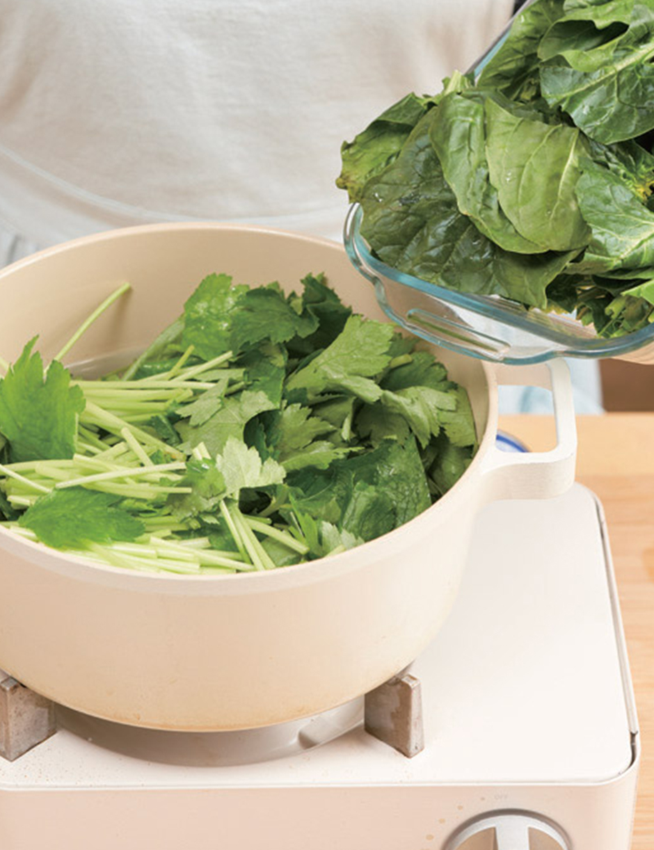 ② 냄비에 물(데치는 용도), 1의 시금치, 참나물을 넣어 뚜껑을 덮고 중·강불에 물이 끓기 직전 불을 끕니다.