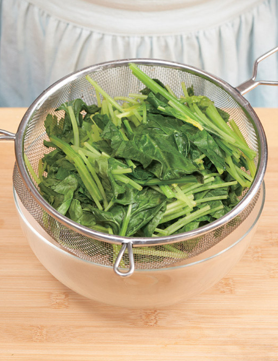 ③ 데친 시금치, 참나물을 건져 살짝 짠 후 체에 밭쳐서 물기를 빼줍니다.